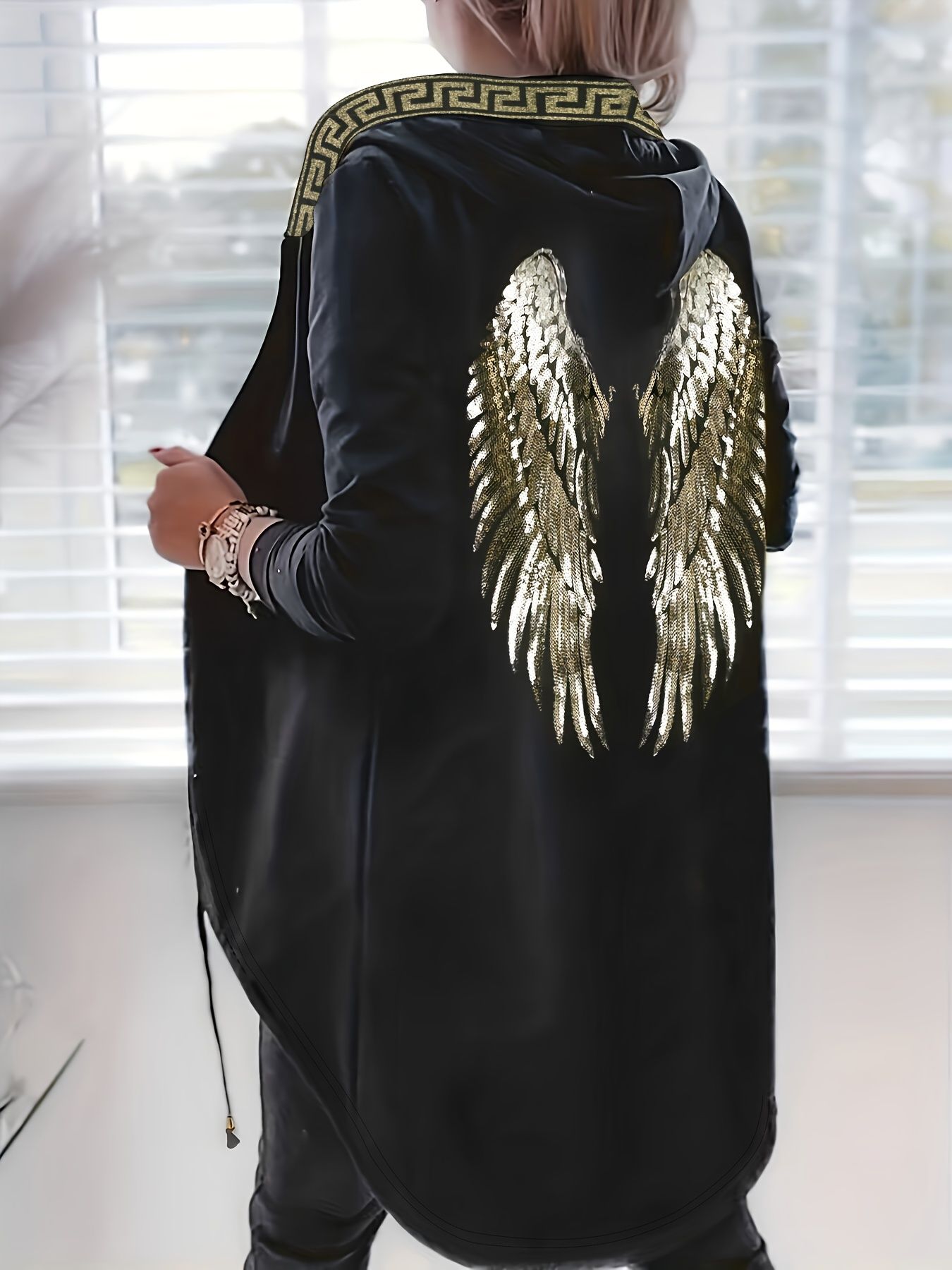 Wings Sequin Hooded Jacket, Open Front Casual Jacket For Spring & Fall, Women’s Clothing